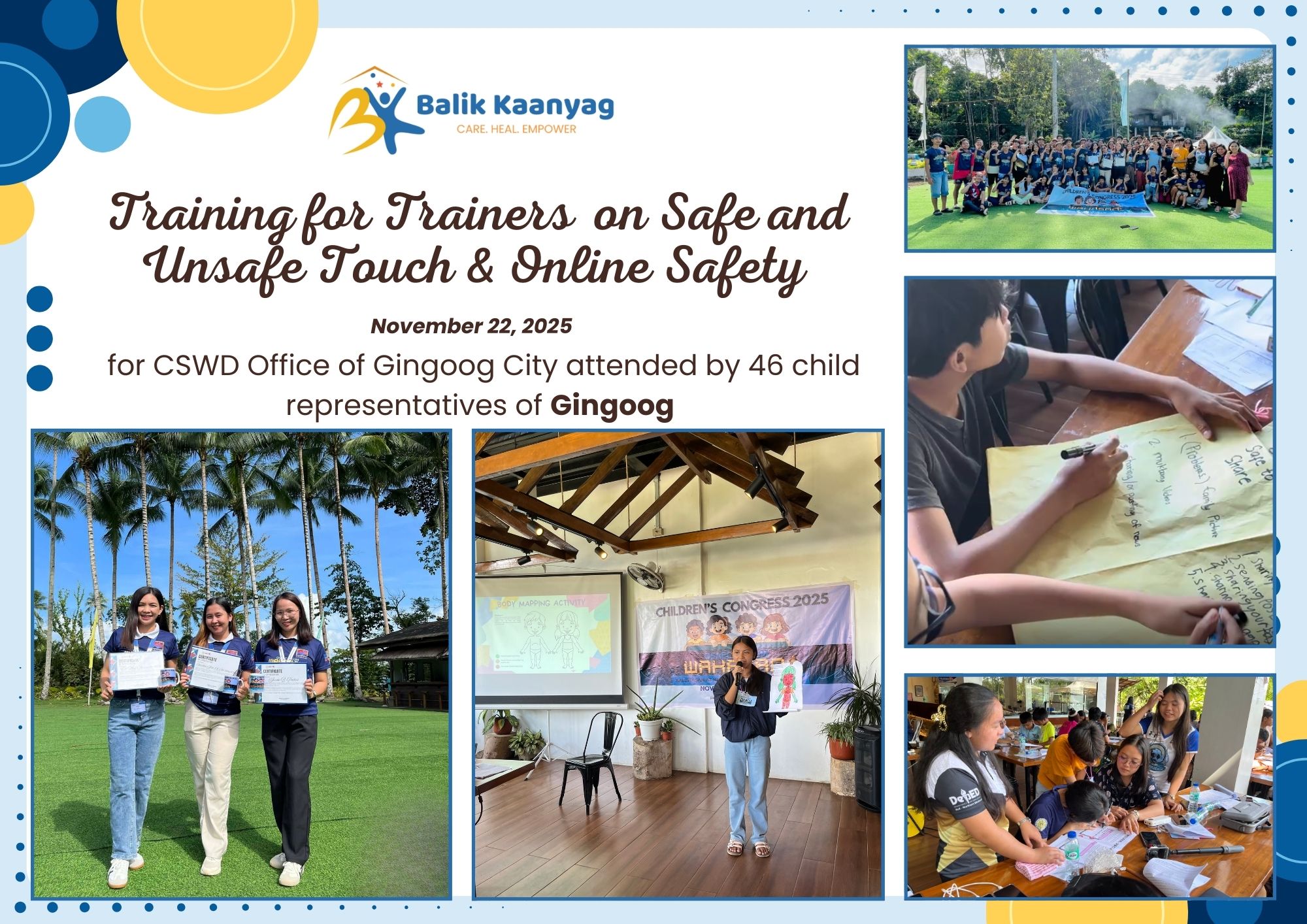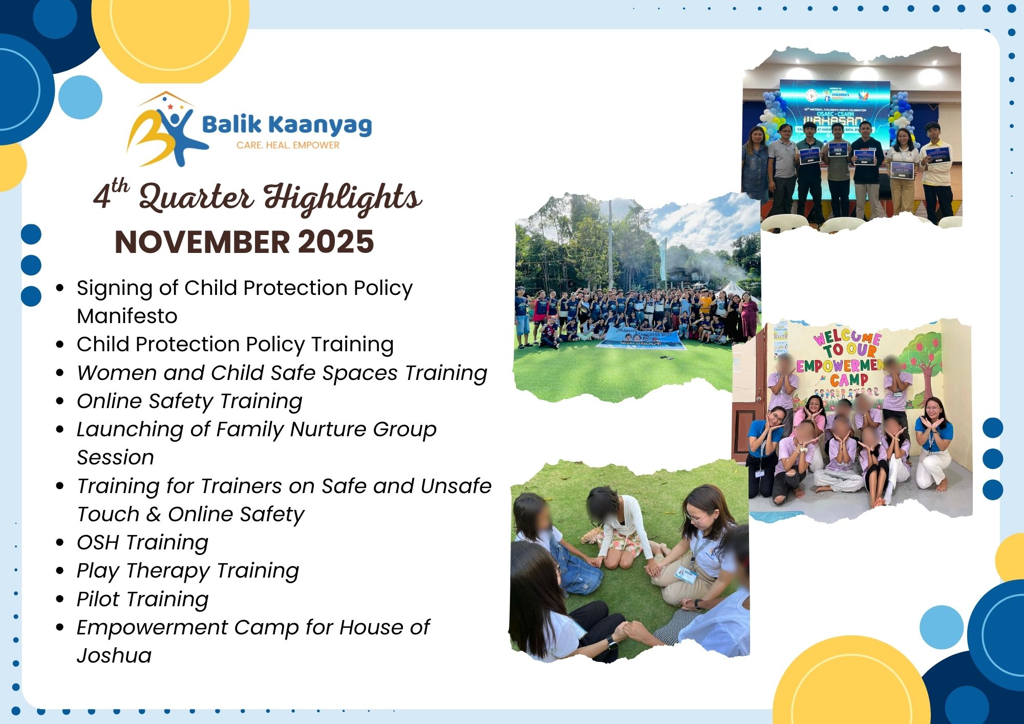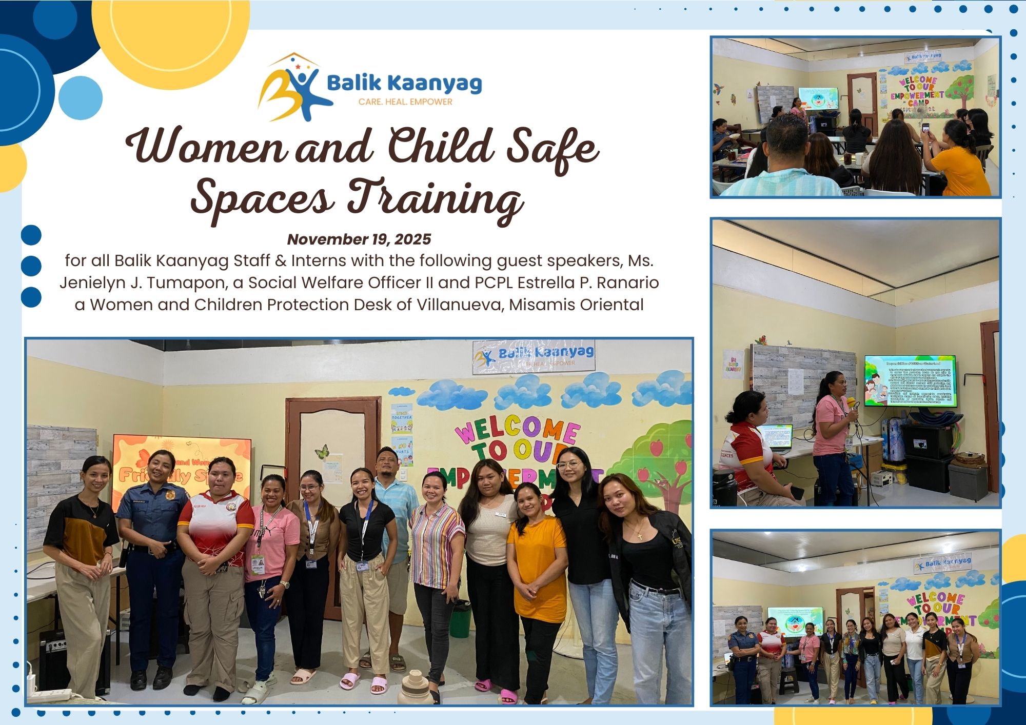 We inaugurated the Balik Kaanyag Child and Family Center in October 2023. It has been two years! We are in awe and gratitude, as we see our vision become reality, one step at a time. We have touched the lives of hundreds of children, students, caregivers, community leaders and organizations. Here are some highlights. To protect the privacy of victims/ survivors of abuse, we blur their faces in the photos.