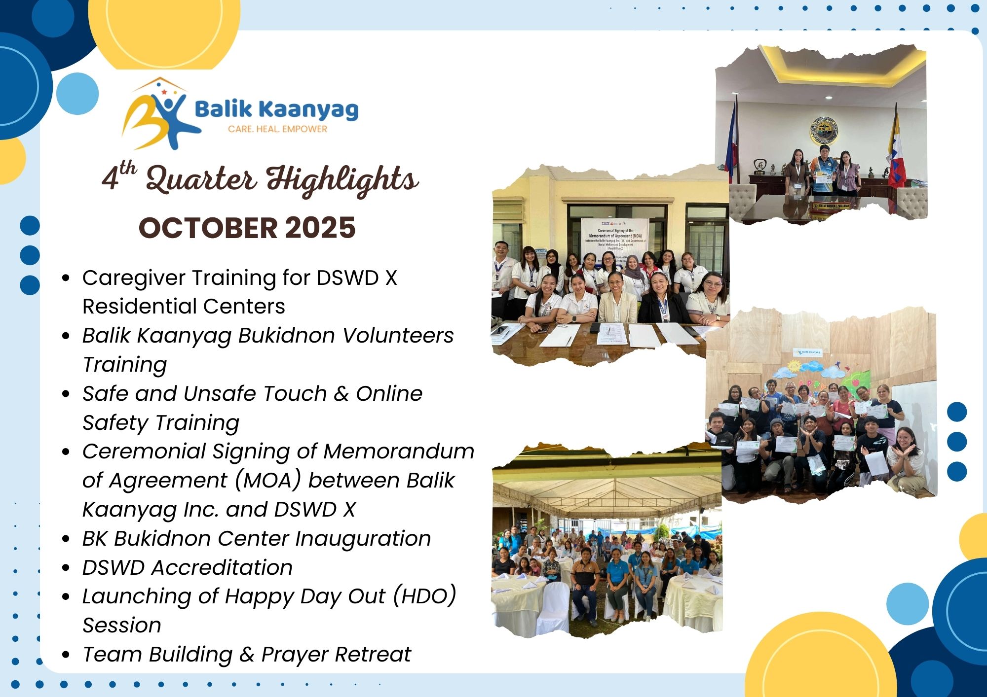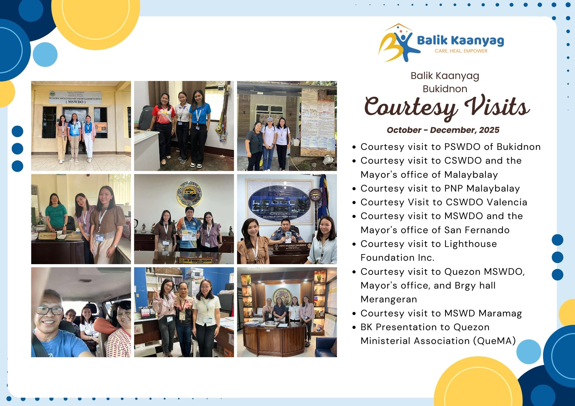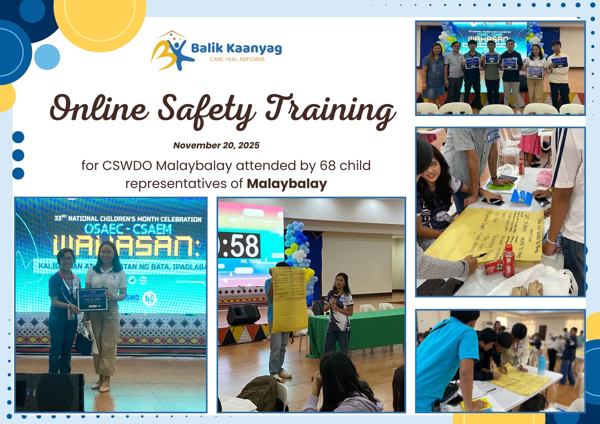We inaugurated the Balik Kaanyag Child and Family Center in October 2023. It has been two years! We are in awe and gratitude, as we see our vision become reality, one step at a time. We have touched the lives of hundreds of children, students, caregivers, community leaders and organizations. Here are some highlights. To protect the privacy of victims/ survivors of abuse, we blur their faces in the photos.